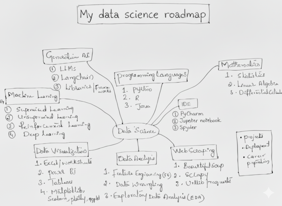 I’m still on my own journey of learning Data Science, and while exploring different courses and projects, I created this roadmap to keep myself consistent and clear about what to learn next. It’s a structured plan I personally follow — and I’m sharing it here for anyone who’s walking the same path and wants a clear direction to begin.
